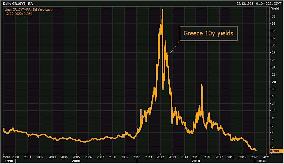 Greece's 10y bond yield drops below 1% for first time ever as hunt for yield defies junk status. Greece's debt to GDP ratio of 180% is highest in Eurozone & among highest in world. During the financial crisis 10y yields rocketed to 45%